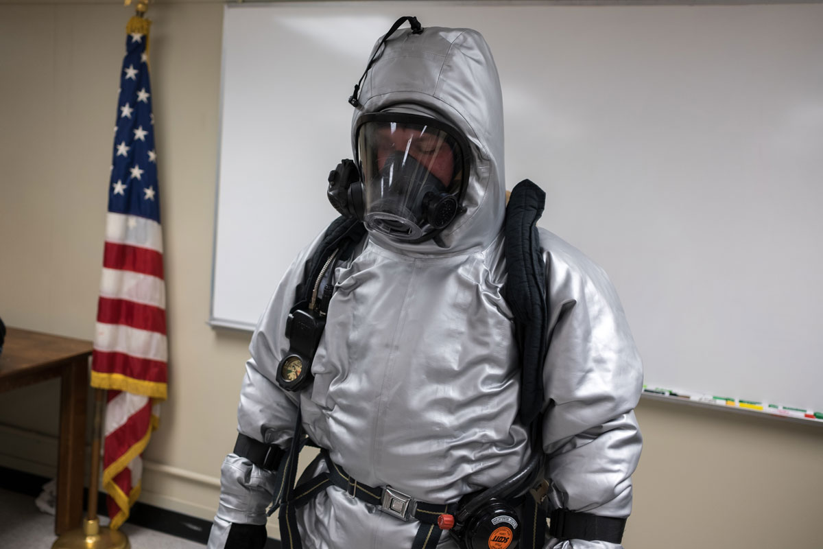 If pressurized steam lines aboard a submarine rupture, they can leak steam at extremely high temperatures, potentially resulting in severe injury or death. To make emergency repairs or rescue crewmates, Sailors must wear protective suits.