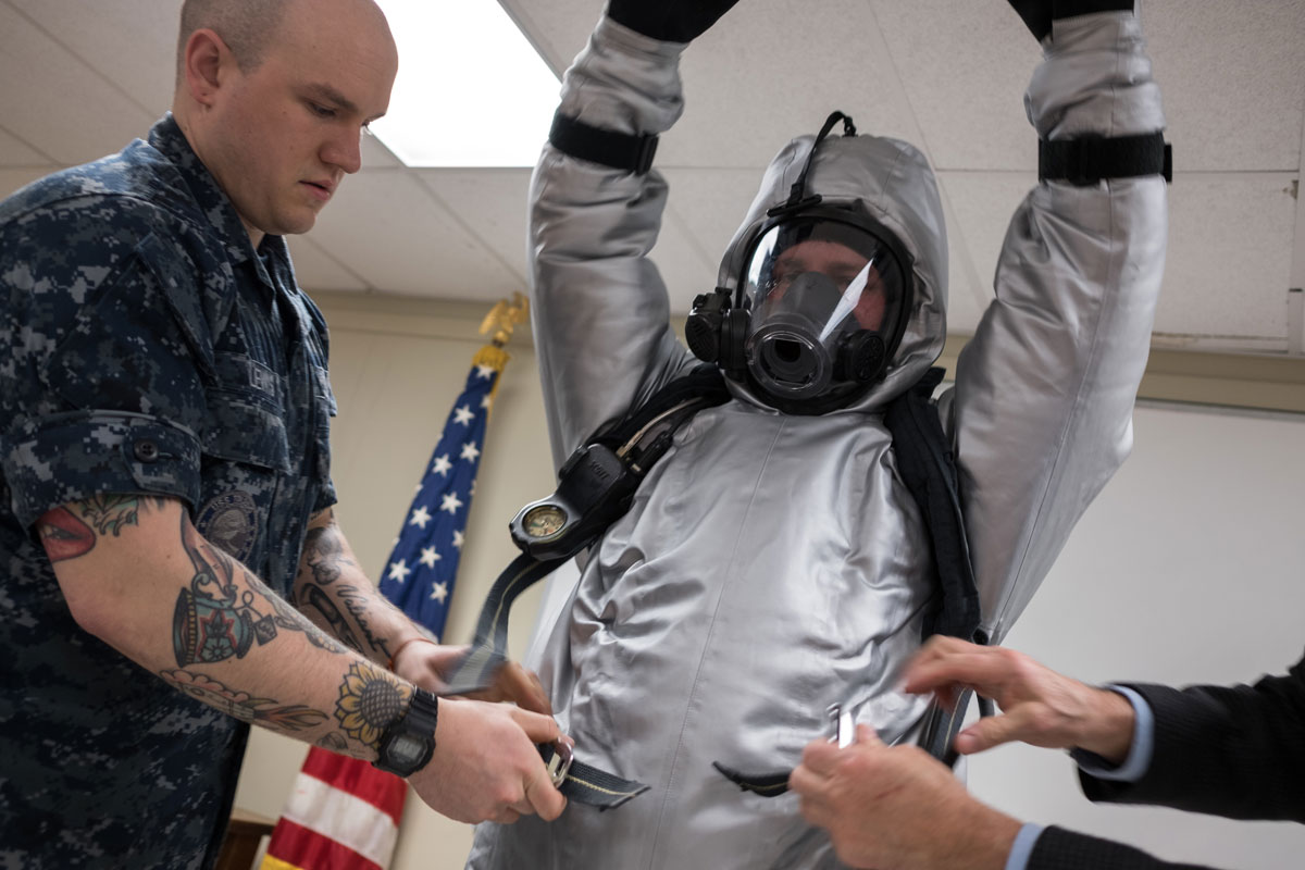 ARLINGTON, Va. - Machinist's Mate 1st Class Nathan Lindner was testing the newest suit designed to protect Sailors from steam leaks on nuclear-powered submarines. He pulled on thick gloves and boots, and donned a face shield for a self-contained breathing apparatus. Then he slid into the sleek, silver prototype steam suit, hoisted an air tank onto his back and connected a regulator to the breathing apparatus. Total time: a little more than two minutes.
