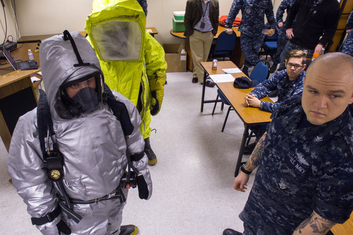 Meanwhile, Machinist's Mate 2nd Class Cameron Sebastian wrestled with the current, older steam suit used Navy-wide. First, he put on boots and a set of firefighters' coveralls, followed by the air tank and breathing apparatus. Finally, he wriggled into a bulky, HAZMAT-style chemical suit. His time: more than double Lindner's.